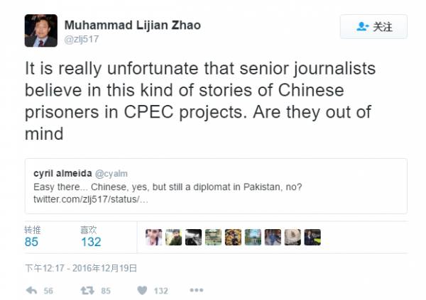 趙立堅(jiān)20日在推特上與巴《黎明報(bào)》記者阿爾梅達(dá)之間的“公開論戰(zhàn)”吸引了大量媒體關(guān)注。印度電視臺稱,針對有傳言說“中國用囚犯當(dāng)勞力,以節(jié)省中巴經(jīng)濟(jì)走廊的經(jīng)費(fèi)”,趙立堅(jiān)稱“荒唐至極,傳播這種謠言的人有不可告人的目的”。他還表示,居然有資深記者相信這樣的謠言,“他們瘋了嗎”?對此,阿爾梅達(dá)在推特上回應(yīng)稱,“不可否認(rèn)這里有令人遺憾的瘋子,但這肯定不是理性(或外交性)的回應(yīng)”,“以這樣的方式在這里(工作),不久你就要長動脈瘤了……”趙立堅(jiān)反嗆說:“造謠中巴經(jīng)濟(jì)走廊使用中國囚犯的人,他們夠理性(外交性)嗎?對于那些人,我只有一個(gè)詞:荒唐。”