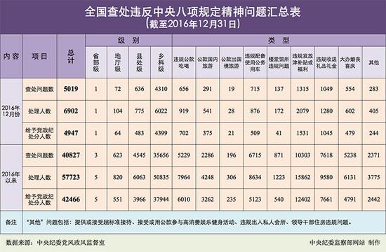 2016年以來,截至12月31日,全國查處違反中央八項規定精神問題情況如下: