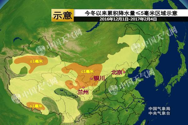 2016年12月以來,北方地區(qū)的內(nèi)蒙古、華北北部、西北等地普遍“貧雪”。據(jù)統(tǒng)計(jì),截至今年2月4日上述地區(qū)累積降水量普遍不足5毫米,特別是內(nèi)蒙古西部、寧夏中北部、甘肅中部等地,累積降水量甚至不足1毫米。此輪降水雖然強(qiáng)度不大,但可算得上“久旱逢甘霖”了。