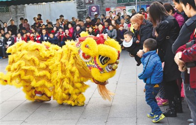 2月9日,在廣東省佛山市禪城區(qū)祖廟內(nèi)的黃飛鴻紀念館,醒獅團隊為前來觀光的游客獻上精彩的舞獅表演,帶來新春祝福,喜迎元宵佳節(jié)。圖為醒獅表演者在現(xiàn)場與游客互動。