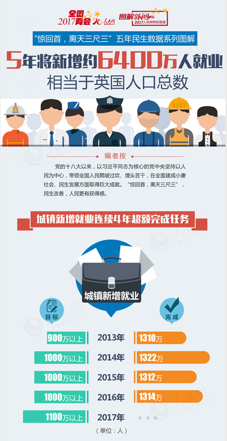 對于2017年發展的主要預期目標,《政府工作報告》提出:“城鎮新增就業1100萬人以上,城鎮登記失業率4.5%以內。”今年城鎮新增就業預期目標比去年多100萬人,突出了更加重視就業的導向。據估算,中國5年來新增約6400萬就業人口,相當于英國全國的人口數。