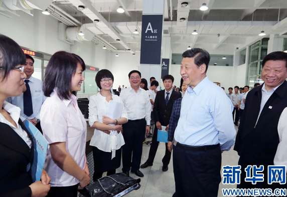 2013年5月14日至15日,中共中央總書記、國家主席、中央軍委主席習近平在天津考察工作。這是習近平在天津人力資源發展促進中心與應聘人員親切交談。新華社記者蘭紅光攝