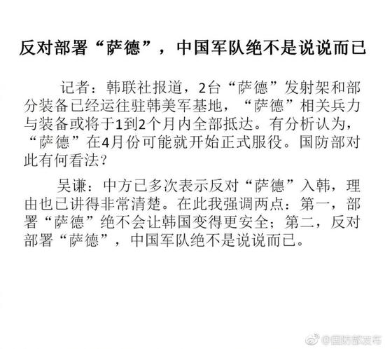 吳謙:中方已多次表示反對“薩德”入韓,理由也已講得非常清楚。在此我強調兩點:第一,部署“薩德”絕不會讓韓國變得更安全;第二,反對部署“薩德”,中國軍隊絕不是說說而已。
