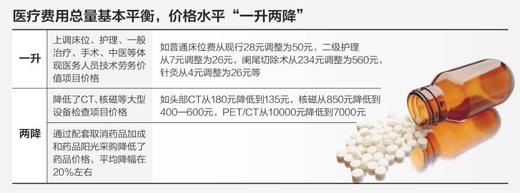 北京市衛(wèi)生計生委新聞發(fā)言人高小俊介紹說,調整后患者費用總體負擔水平?jīng)]有增加。改革保持全市醫(yī)療費用總量基本平衡,價格水平“一升兩降”:上調床位、護理、一般治療、手術、中醫(yī)等體現(xiàn)醫(yī)務人員技術勞務價值項目價格;降低了CT、核磁等大型設備檢查項目價格;降低了藥品價格。高小俊舉例說,如普通床位費從現(xiàn)行28元調整為50元,二級護理從7元調整為26元,闌尾切除術從234元調整為560元等;頭部CT從180元降低到135元,核磁從850元降低到400—600元,PET/CT從10000元降低到7000元;而通過配套取消藥品加成和藥品陽光采購,藥品價格平均降幅20%左右。