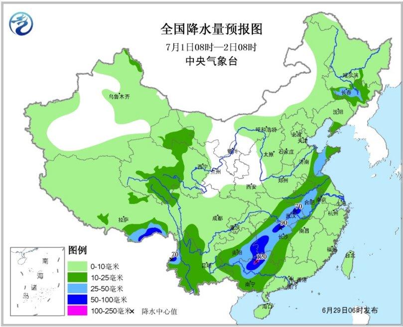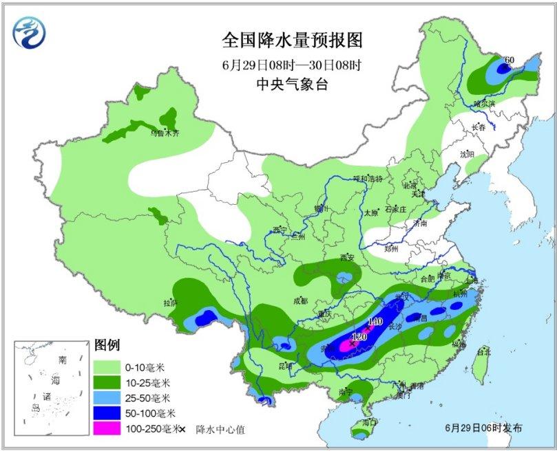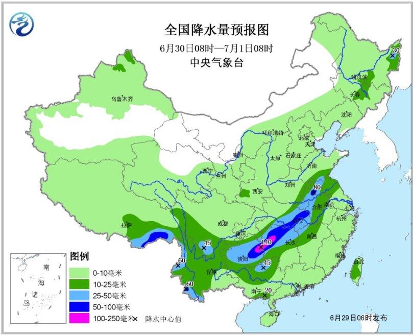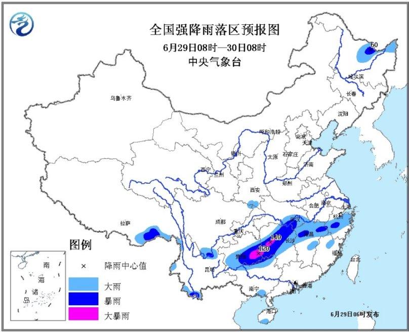 貴州湖南江西等地有強降雨。29日夜間至7月2日,主雨帶北抬,西南地區東部、江南西部、江漢東部、江淮、黃淮南部等地將有強降雨過程。其中,29日08時至30日08時,貴州東南部、廣西北部、湖南中北部、湖北東南部、江西北部、浙江中西部、云南西南部和東北部等地有暴雨,其中貴州東南部、湖南西部等地局地有大暴雨(100~140毫米);上述部分地區有短時強降水、局地伴有雷暴大風等強對流天氣,最大小時雨強20~40毫米,局地可超過50毫米(見圖1)。中央氣象臺6月29日06時繼續發布暴雨藍色預警。