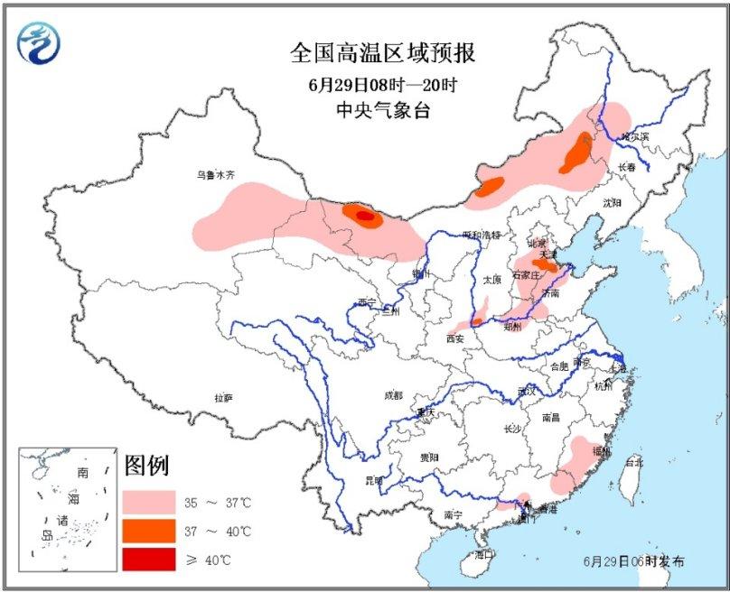 圖2 全國高溫區域預報圖(6月29日08時-29日20時)