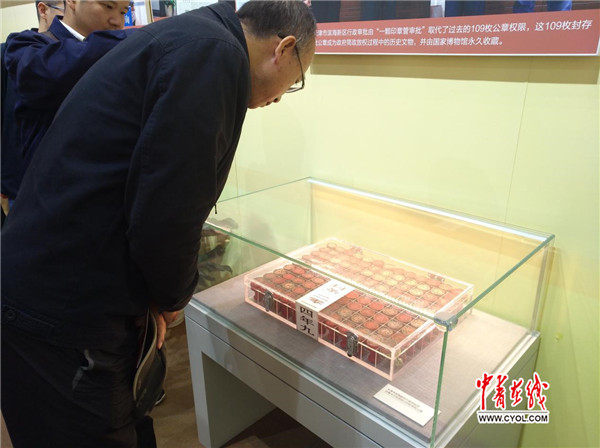 在第三展區(qū),天津市濱海新區(qū)行政審批局辦事大廳封存的109枚審批公章吸引了許多參觀者的駐足。據(jù)工作人員介紹,2014年5月20日,天津市濱海新區(qū)行政審批局掛牌成立,原來分散在18個不同部門的216項(xiàng)審批職責(zé)歸并到了1個部門,1枚公章取代了109枚公章,“這109枚公章真實(shí)見證了政府簡政放權(quán)的過程。”