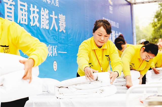 11月2日,在重慶市兩江新區(qū)舉行的“農(nóng)轉(zhuǎn)非”人員技能大賽,參加養(yǎng)老護(hù)理項(xiàng)目競賽的選手正在整理床上用品。