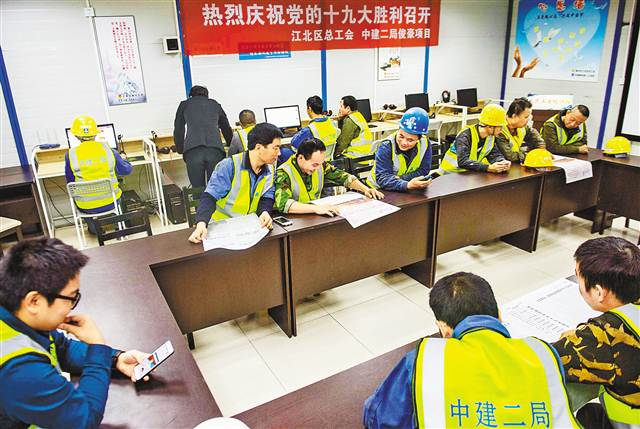 重慶市江北嘴中建二局工地農(nóng)民工夜校的學(xué)員在課間關(guān)注十九大相關(guān)新聞。他們通過夜校的培訓(xùn),成為了有技能有文化的新型工人。 記者 崔力攝