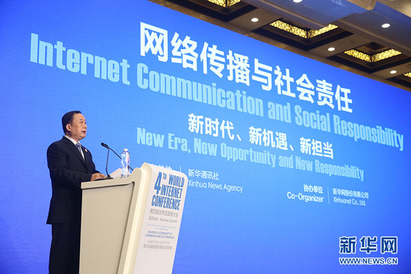 由新華社主辦、新華網(wǎng)協(xié)辦的第四屆世界互聯(lián)網(wǎng)大會(huì)“網(wǎng)絡(luò)傳播與社會(huì)責(zé)任”論壇12月4日上午在烏鎮(zhèn)舉行。圖為國(guó)家互聯(lián)網(wǎng)信息辦公室副主任任賢良致辭。新華社記者 鄭煥松 攝