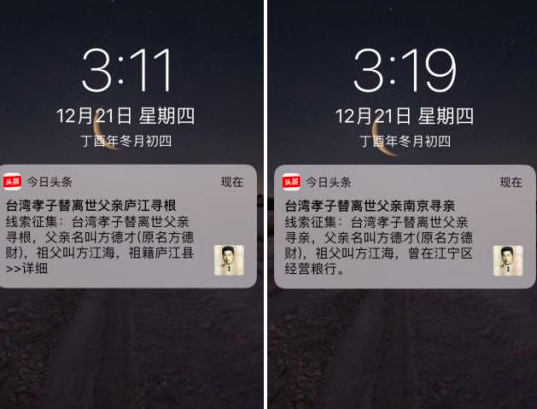 接到求助信息后,頭條尋人立刻發(fā)布了《今日頭條兩岸尋親:臺(tái)灣孝子替離世父親尋根 尋找合肥或南京的親屬》的尋親消息,把他精準(zhǔn)地彈窗推送給了安徽合肥和江蘇南京的網(wǎng)友,短短4個(gè)小時(shí)之后,就成功聯(lián)系上了方志鵬要找的大陸親人方英懷。