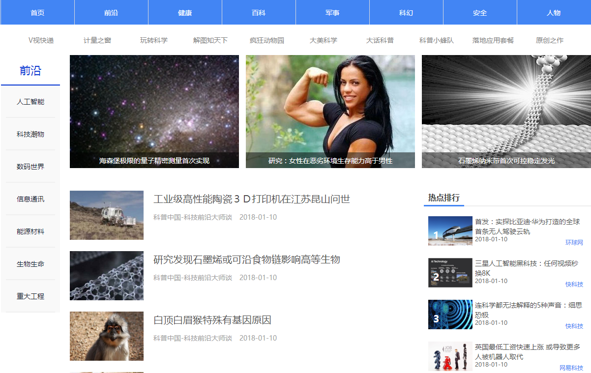 作為中國科普的重要傳播窗口,科普中國網(wǎng)2.0版本在內容方面,以市場調研為基礎,以科普內容的學科門類及用戶所關注的熱門內容為分類依據(jù),從傳播學角度對過往欄目進行整合重構,最終形成了包括前沿、健康、軍事等七大頻道。同時,還針對時下熱門,以及有趣的科普知識點進行整合,通過專題頁面,以科普游戲、視頻、漫畫等多樣化、參與和趣味感十足的形式,為廣大網(wǎng)友帶來全新的科普體驗。