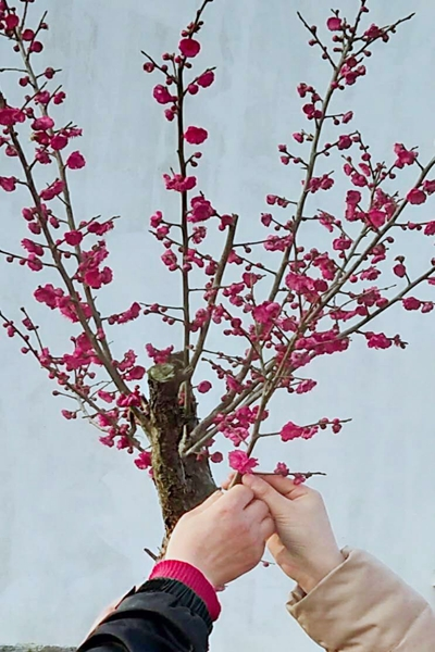 在廣袤的郊外,我們兩個人有種信步天地間的逍遙自在!路過二姑父的“世外桃源”時,一股沁人心脾的清香襲來。原來是他果園里那株去年移植的烏梅正開的熱烈!