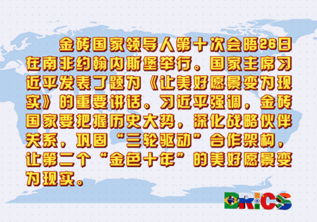 時代大潮奔騰不息,不以任何人的意志為轉(zhuǎn)移。金磚國家要把握歷史大勢,深化戰(zhàn)略伙伴關(guān)系,鞏固“三輪驅(qū)動”合作架構(gòu),讓第二個“金色十年”的美好愿景變?yōu)楝F(xiàn)實,攜手邁向人類命運共同體。