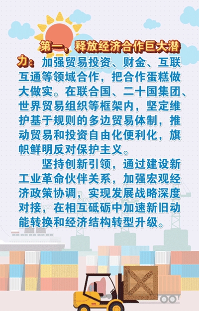 第一,釋放經(jīng)濟合作巨大潛力。加強經(jīng)濟合作、實現(xiàn)共同發(fā)展是金磚合作的初衷和主線,也是潛力最大、內(nèi)容最豐富、成果最集中的領(lǐng)域。我們要加強貿(mào)易投資、財金、互聯(lián)互通等領(lǐng)域合作,把合作蛋糕做大做實。要在聯(lián)合國、二十國集團、世界貿(mào)易組織等框架內(nèi),堅定維護基于規(guī)則的多邊貿(mào)易體制,推動貿(mào)易和投資自由化便利化,旗幟鮮明反對保護主義。