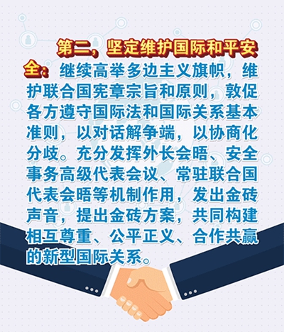 第二,堅定維護國際和平安全。政治安全合作是金磚戰(zhàn)略伙伴關(guān)系的重要內(nèi)容。我們要繼續(xù)高舉多邊主義旗幟,維護聯(lián)合國憲章宗旨和原則,敦促各方遵守國際法和國際關(guān)系基本準則,以對話解爭端,以協(xié)商化分歧。要充分發(fā)揮外長會晤、安全事務高級代表會議、常駐聯(lián)合國代表會晤等機制作用,發(fā)出金磚聲音,提出金磚方案,共同構(gòu)建相互尊重、公平正義、合作共贏的新型國際關(guān)系。