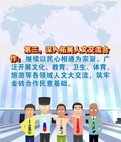 第三,深入拓展人文交流合作。金磚五國孕育出各自燦爛文明,彼此交相輝映,人文交流合作大有可為。去年和今年,金磚人文交流明顯提速。我們要繼續(xù)以民心相通為宗旨,廣泛開展文化、教育、衛(wèi)生、體育、旅游等各領(lǐng)域人文大交流,筑牢金磚合作民意基礎(chǔ)。中方建議舉行金磚博物館、美術(shù)館、圖書館聯(lián)盟聯(lián)合巡展等活動,加強文化創(chuàng)意產(chǎn)業(yè)、旅游、地方城市等領(lǐng)域合作,講述更多精彩動人的金磚故事,不斷增進五國人民相互了解和傳統(tǒng)友誼。