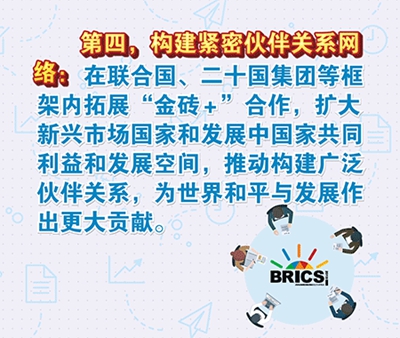 第四,構(gòu)建緊密伙伴關(guān)系網(wǎng)絡(luò)。金磚機制成立伊始,我們就共同確定了走開放包容之路的正確方向。廈門會晤更確立了“金磚+”合作理念,其要義是在不斷強化五國團結(jié)協(xié)作內(nèi)核,提升金磚向心力、凝聚力的同時,持續(xù)擴大金磚“朋友圈”,同廣大新興市場國家和發(fā)展中國家實現(xiàn)共同發(fā)展繁榮。我們要在聯(lián)合國、二十國集團等框架內(nèi)拓展“金磚+”合作,擴大新興市場國家和發(fā)展中國家共同利益和發(fā)展空間,推動構(gòu)建廣泛伙伴關(guān)系,為世界和平與發(fā)展作出更大貢獻。