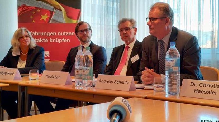 德中經濟聯合會顧問委員會主席施密茨(右一)正在新聞發布會上發言。圖片來源:德國之聲網站報道截圖