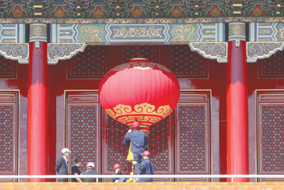 北京市美術紅燈廠工人將紅色布料貼在骨架上。本報記者賀勇攝。