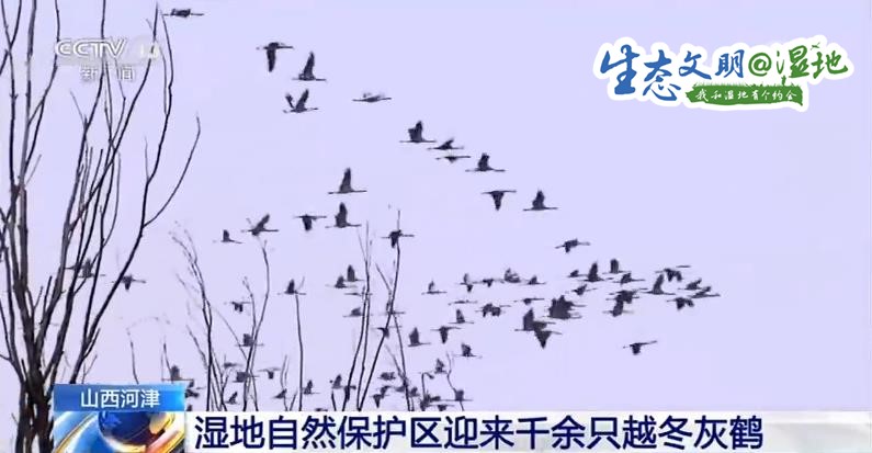 央視網消息: 近日,在山西河津市黃河濕地自然保護區迎來了千余只越冬的灰鶴。偶爾有幾只翩翩起舞、向天空飛去,構成了一幅獨特的“候鳥天堂畫卷”。