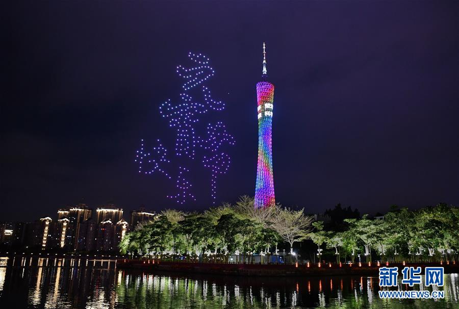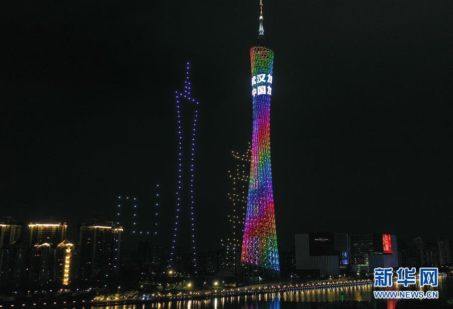 2月9日凌晨,廣州珠江上空的無人機(jī)編隊組成廣州塔和黃鶴樓圖形。 當(dāng)日凌晨,無人機(jī)編隊在廣州珠江上空拼出“抗擊疫情”“武漢加油”“元宵節(jié)快樂”字樣以及廣州塔和黃鶴樓圖形等,為武漢加油。 新華社記者 劉大偉 攝
