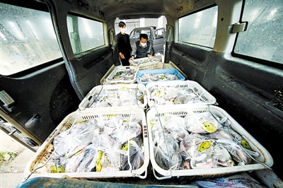 3月17日,武漢市東西湖區東山街道群力村,人們爭分奪秒地往車上裝運活鮮魚。1小時后,它們將準時抵達專供的社區。