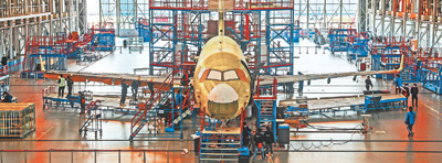 3月6日,工人在中國商飛上海飛機制造有限公司的生產(chǎn)車間內(nèi)作業(yè)。