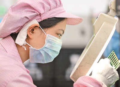 3月31日,在中國信科集團烽火通信公司系統(tǒng)設備制造部的5G智造車間,工人正在生產(chǎn)相關設備。