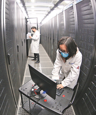 3月24日,中國移動(襄陽)數(shù)據(jù)中心,網(wǎng)絡工程師在新型綠色倉儲式數(shù)據(jù)中心進行網(wǎng)絡調(diào)試。