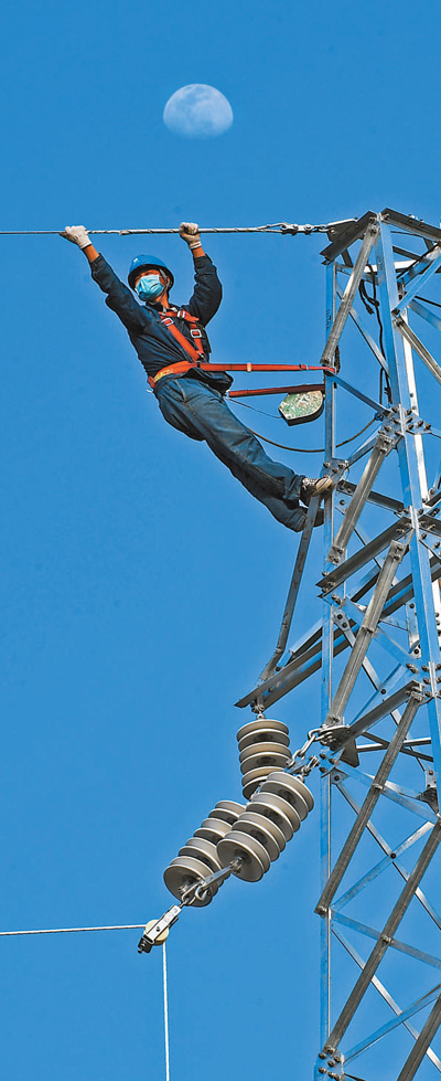 4月4日,在安徽省亳州市譙城區(qū),國網(wǎng)亳州供電公司電力工人正在架設輸電線路。