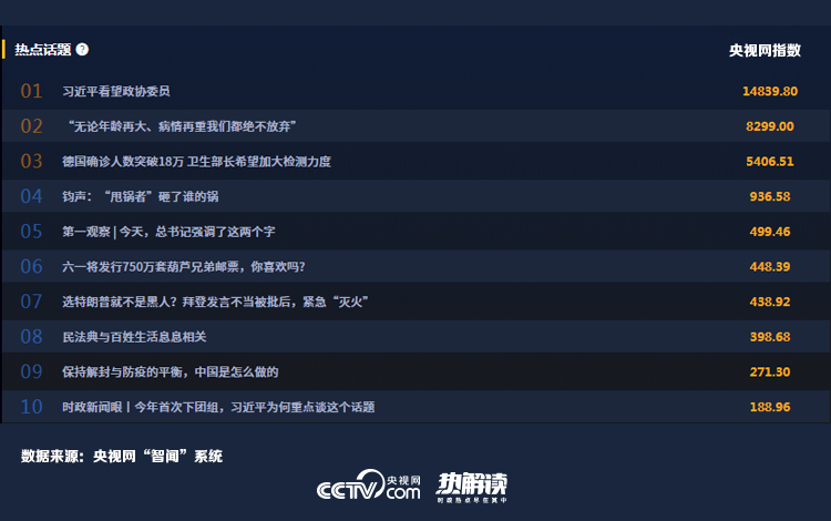據央視網“智聞”系統“央視網指數”熱度顯示,23日下午,總書記參加經濟界委員聯組會的新聞迅速高居榜首。