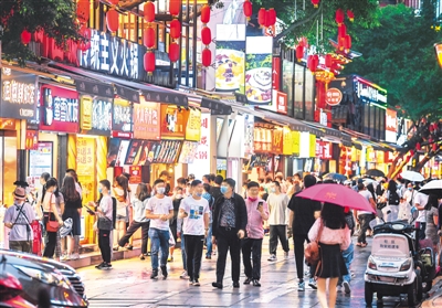 日前,重慶市多措并舉,在做好疫情防控的同時,積極推進餐廳、酒吧、沿街小吃等復工,有序恢復“夜經濟”。重燃夜市的煙火氣,連接著促就業的大民生,也讓一座城市更有活力。圖為重慶市解放碑好吃街,市民們一邊逛街,一邊挑選美味的小吃。