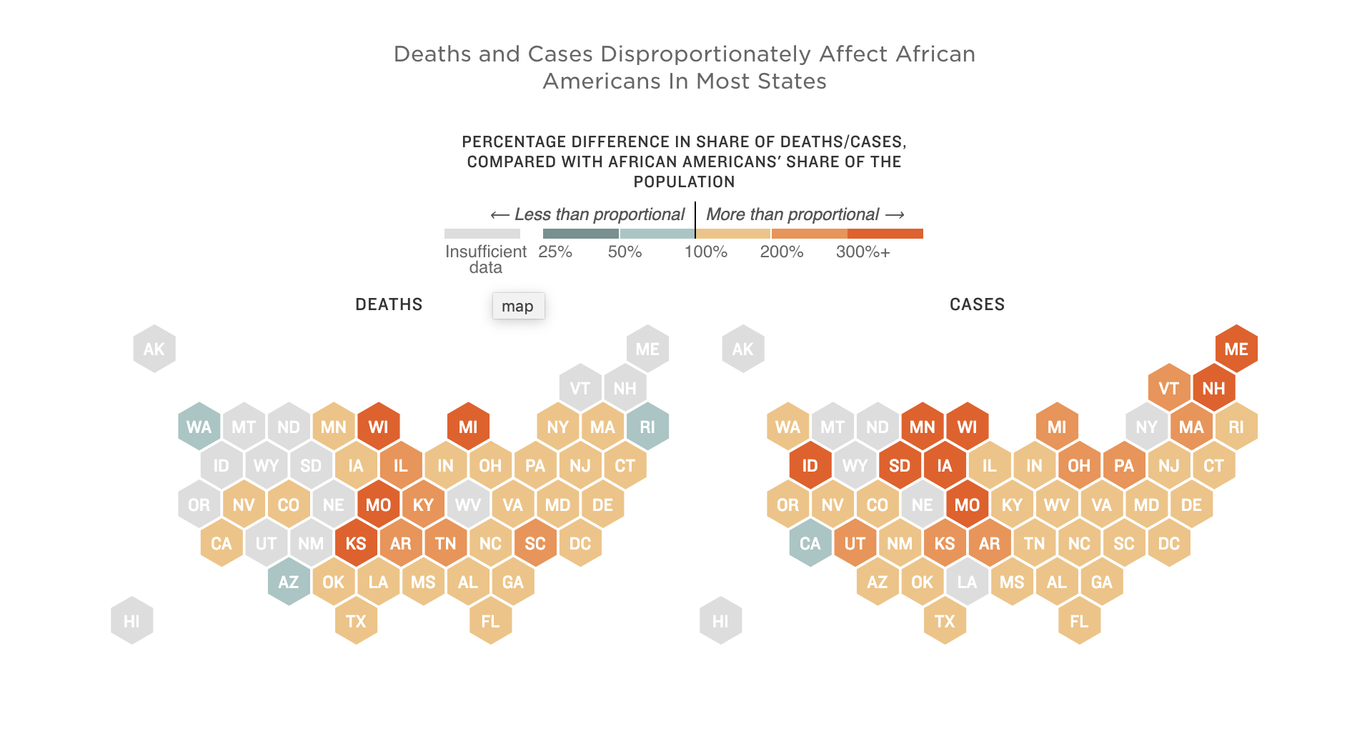 以威斯康星州為例,該州非洲裔人口占比為6%,而該州的新冠肺炎病亡病例中,非洲裔占比高達(dá)27%,明顯高于其人口占比。這種情況在統(tǒng)計(jì)圖中以橙黃色標(biāo)記,情況越嚴(yán)重顏色越深。可以看到,無(wú)論是新冠肺炎的病亡病例,還是確診病例,非洲裔的占比都要高出其人口占比。