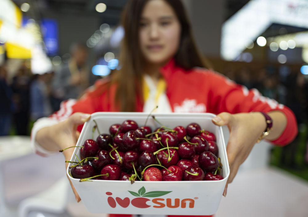 ▲第二屆進博會上,工作人員在食品及農(nóng)產(chǎn)品展區(qū)展示智利車?yán)遄印?/p>