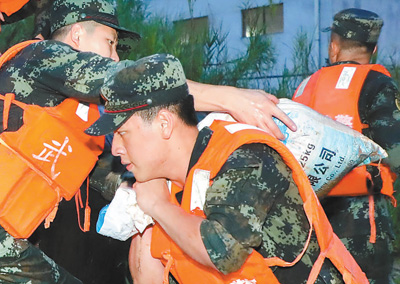 受持續強降雨影響,廣西賀州賀江水位急速上升,引發洪澇災害。圖為武警官兵搬運沙袋。張畢海攝(影像中國)
