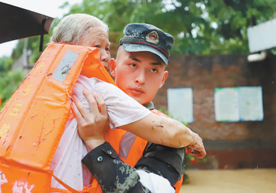 重慶市涪陵區龍潭鎮龍潭河受暴雨影響急劇上漲,沿線多處道路被沖毀。圖為6月28日,一位受困老人被安全轉移。肖樂峰攝(影像中國)