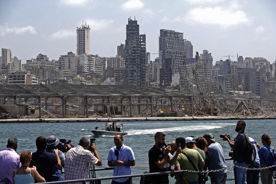 2020年8月8日,媒體記者在被炸毀的黎巴嫩貝魯特港口區(qū)采訪。貝魯特港口區(qū)4日傍晚發(fā)生劇烈爆炸,迄今爆炸已造成158人死亡、6000多人受傷,另有數(shù)十人下落不明。爆炸還造成約30萬民眾無家可歸。 新華社發(fā)(比拉爾·賈維希 攝)
