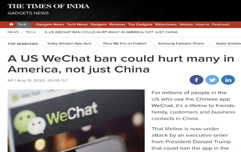 《印度時報》近日報道指出,美國的微信“禁令”可能不僅傷害中國,還會傷害很多在美人士。