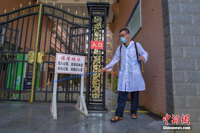 資料圖:海口經(jīng)濟(jì)學(xué)院的工作人員在學(xué)生宿舍樓入口消毒。 中新社記者 駱云飛 攝