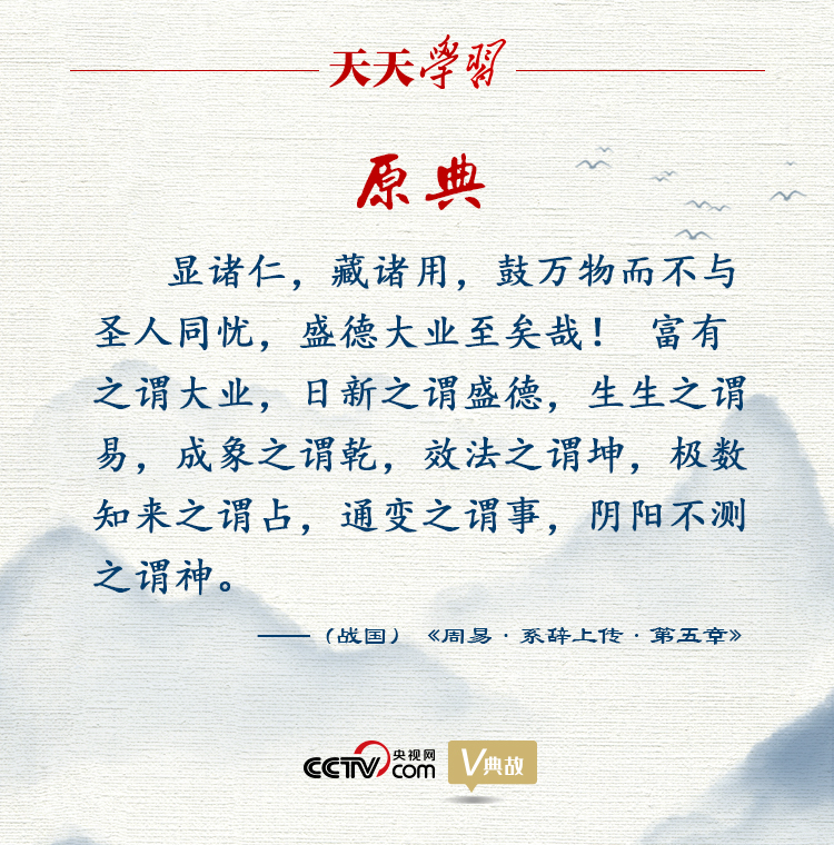 上述講話中引用的“富有之謂大業,日新之謂盛德”出自《周易·系辭上傳》,意思是:廣泛創造物質財富和精神財富叫做弘大功業,持續永遠的日日增新叫做盛美德行。