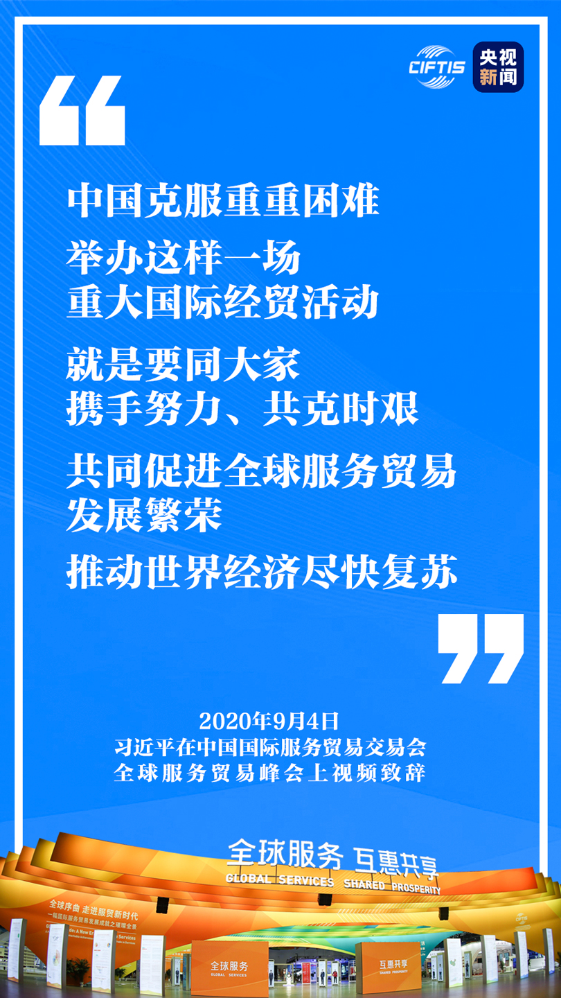 中國克服重重困難,舉辦這樣一場重大國際經貿活動,就是要同大家攜手努力、共克時艱,共同促進全球服務貿易發展繁榮,推動世界經濟盡快復蘇。