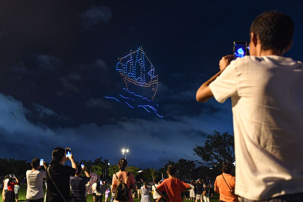 ↑10月2日,人們?cè)诤?谑腥f(wàn)綠園觀看無(wú)人機(jī)燈光秀表演。 新華社記者 蒲曉旭 攝