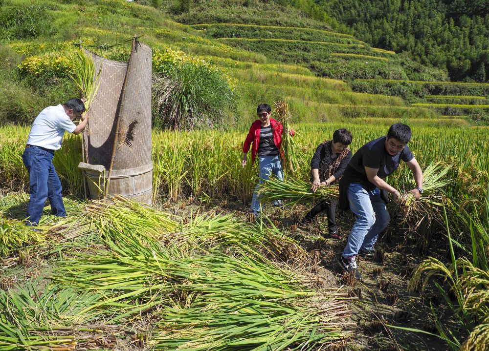 ↑10月3日,在景寧縣小佐梯田,來(lái)自上海的游客體驗(yàn)收割水稻。新華社發(fā)(李肅人 攝)
