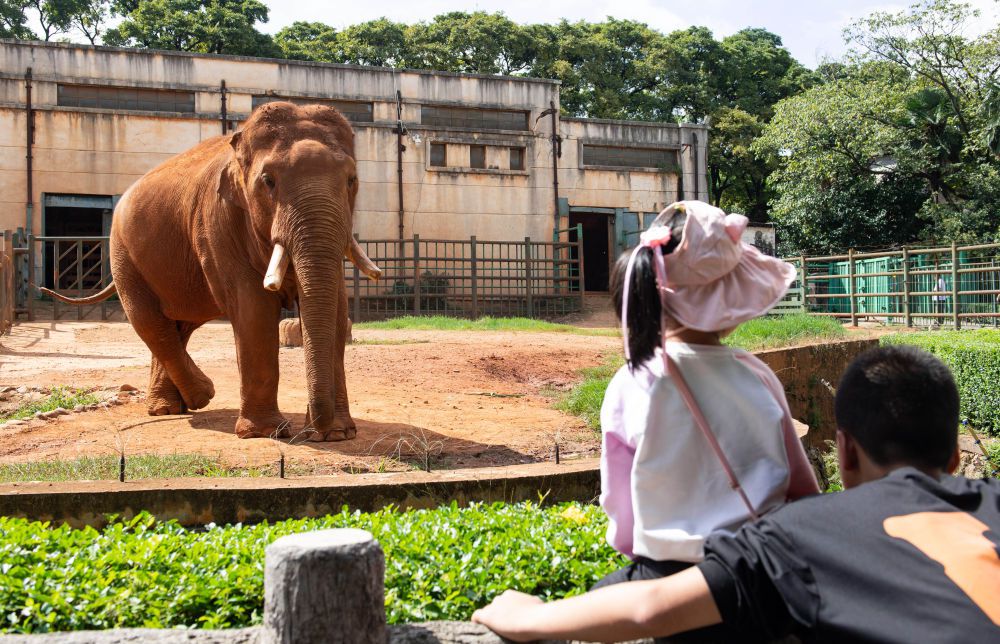 ↑10月4日,游客在昆明動(dòng)物園內(nèi)觀看亞洲象。新華社發(fā)(王冠森攝)
