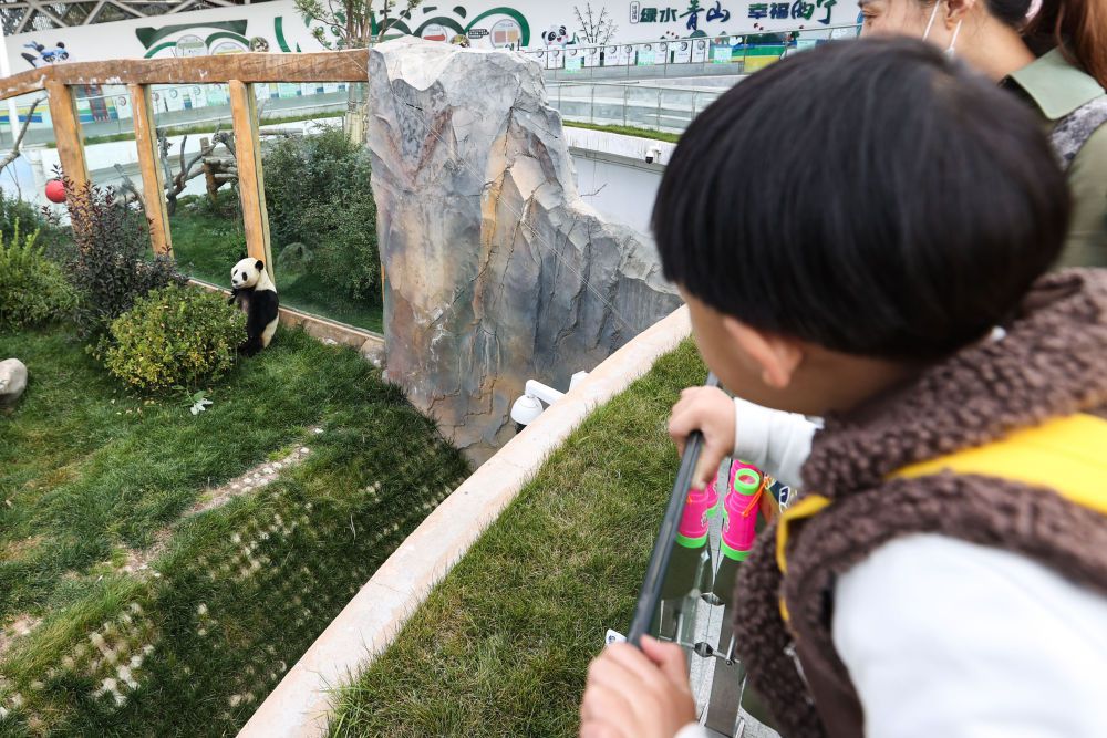 ↑10月4日,游客在西寧熊貓館內(nèi)觀看熊貓。新華社記者 吳剛 攝