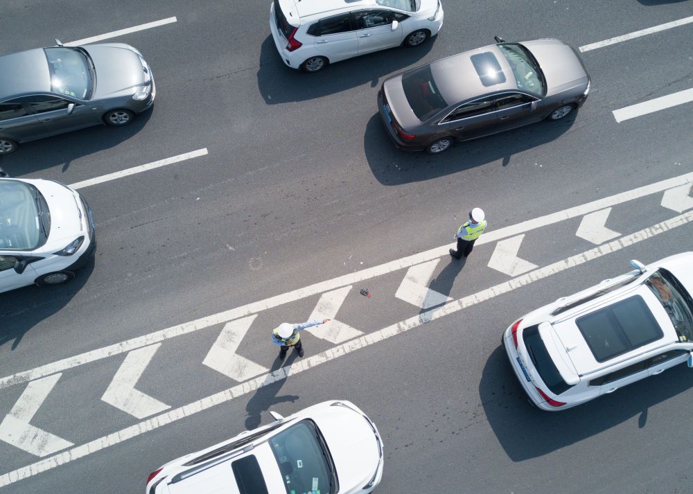 ↑10月1日,在福州螺洲大橋出城方向,交警疏導(dǎo)交通(無(wú)人機(jī)照片)。新華社記者 宋為偉 攝