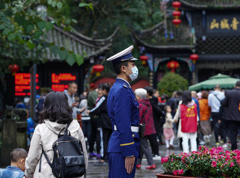 ↑10月4日,四川森林消防總隊(duì)特勤大隊(duì)一中隊(duì)消防員在青城山-都江堰景區(qū)執(zhí)勤。新華社記者 江宏景 攝