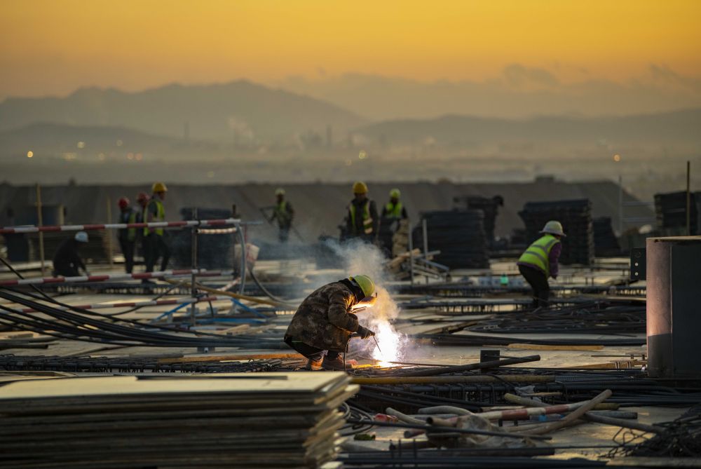 ↑在新疆烏魯木齊機(jī)場(chǎng)改擴(kuò)建工程航站樓施工現(xiàn)場(chǎng),中建三局的工人在焊接鋼筋(10月2日攝)。新華社記者 胡虎虎 攝