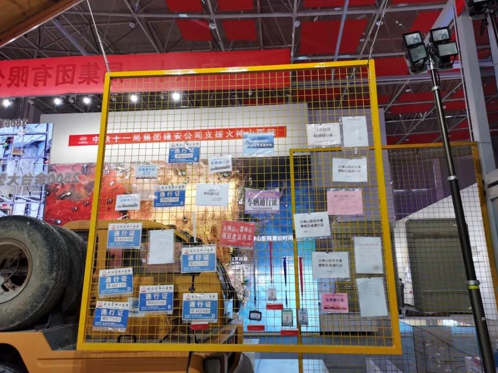 展覽還原火神山醫院、雷神山醫院建設的場景,大型吊車、病房、車輛通行證、工作服等實物均被搬到現場。